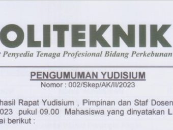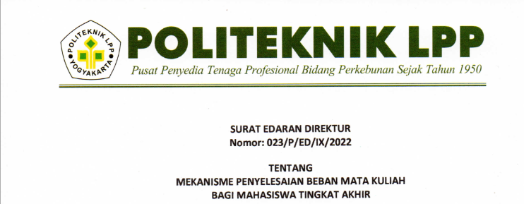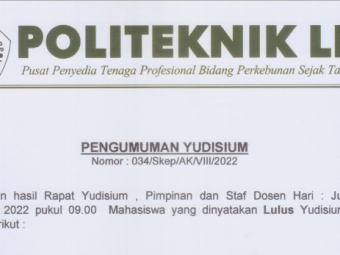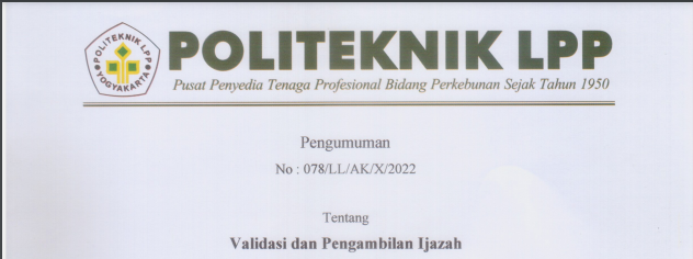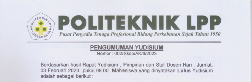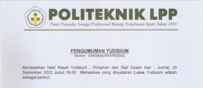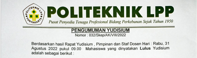 Pengumuman No : 066/LL/AK/VIII/2022 Tentang Tahapan Yudisium TA 2021/2022 Bagi Mahasiswa tingkat akhir menyerahkan ke loket BAA atau mengirimkan via email (yudisium@polteklpp.ac.id) surat pernyataan pra yudisium (bisa di download di we..