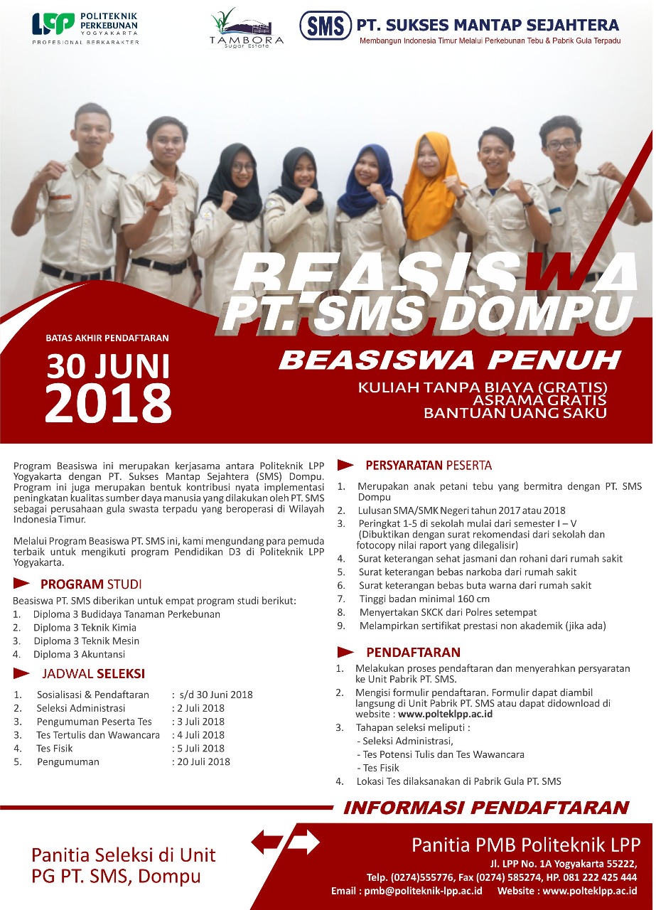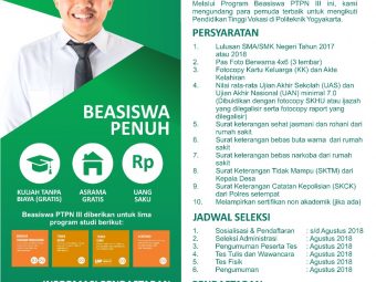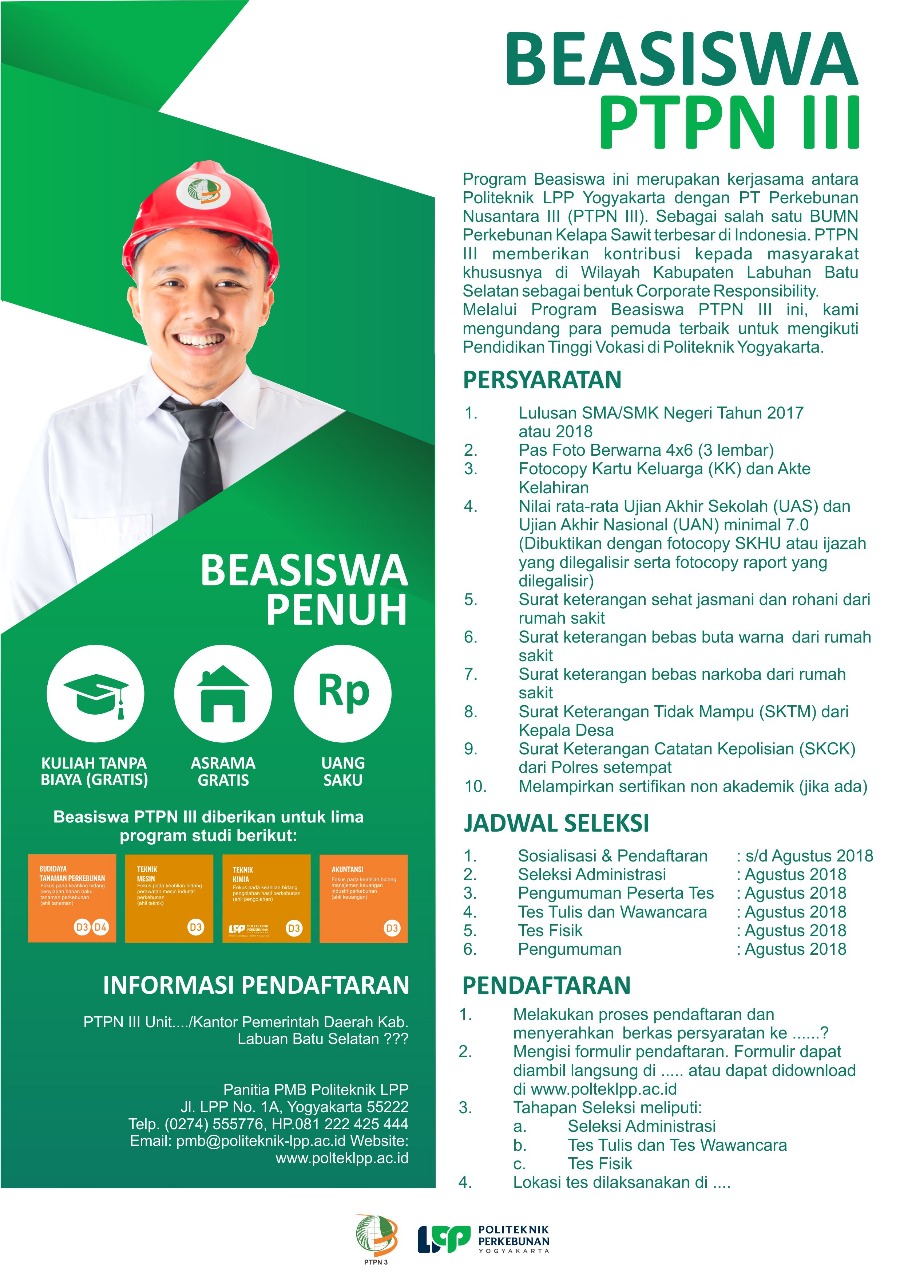Program Beasiswa ini merupakan kerjasama antara Politeknik Perkebunan LPP Yogyakarta dengan PT. Perkebunan Nusantara III (Persero). Sebagai salah satu BUMN Perkebunan Kelapa Sawit terbesar di Indonesia. PTPN III (Persero) memberikan kontribusi..