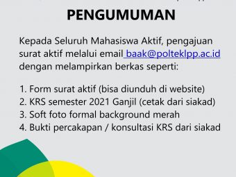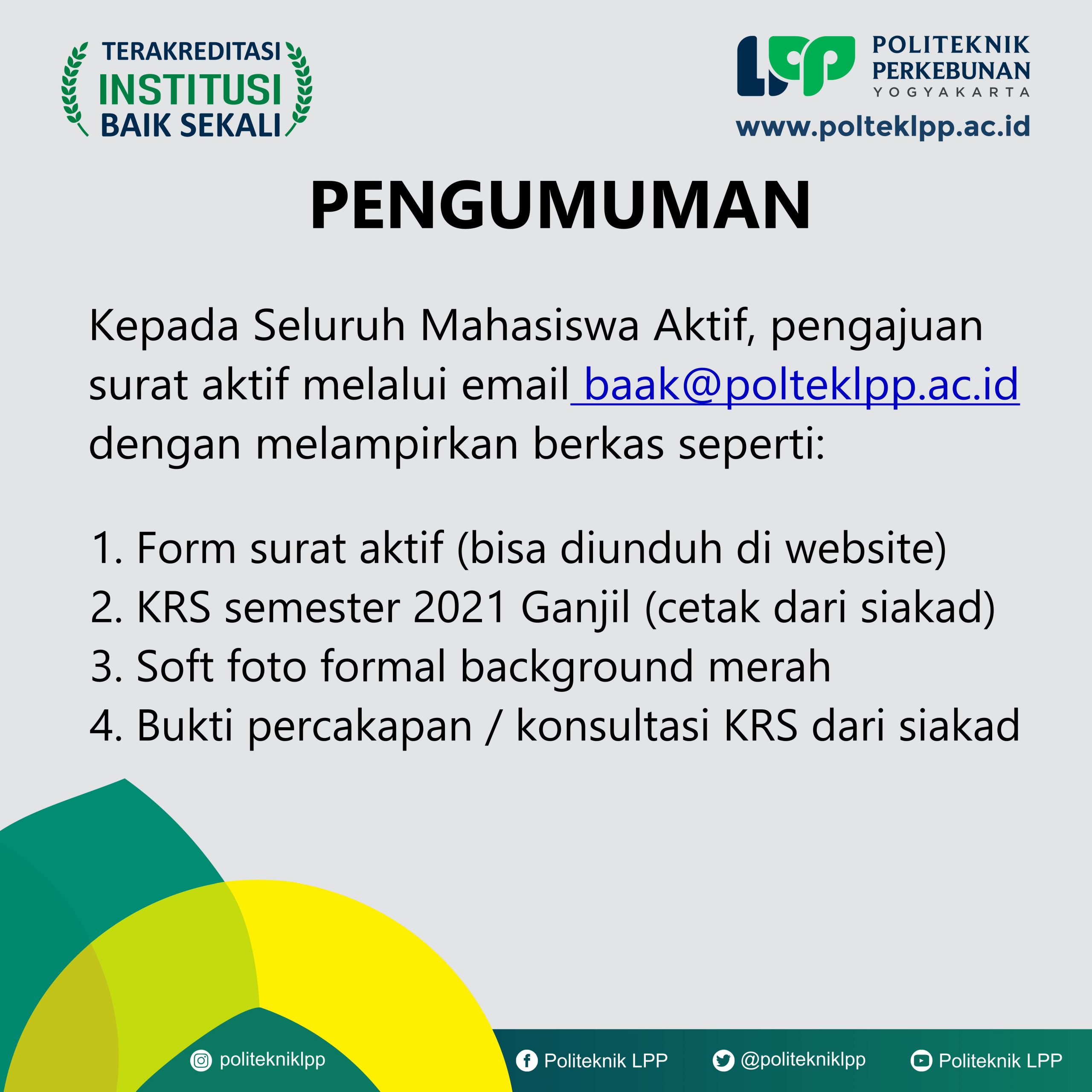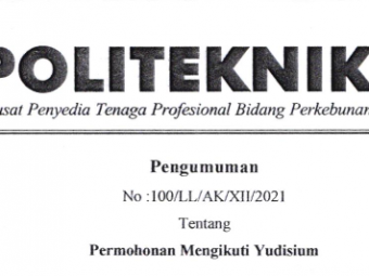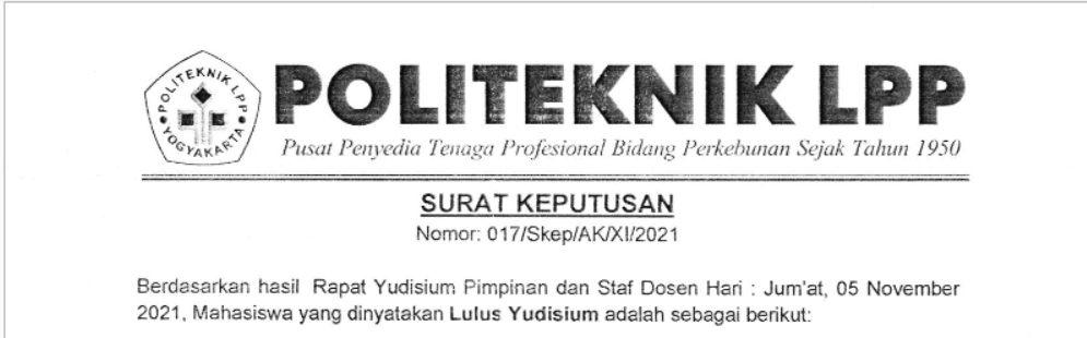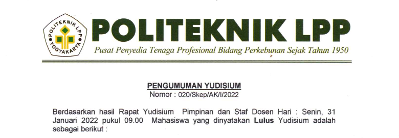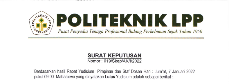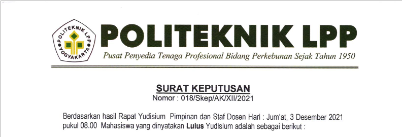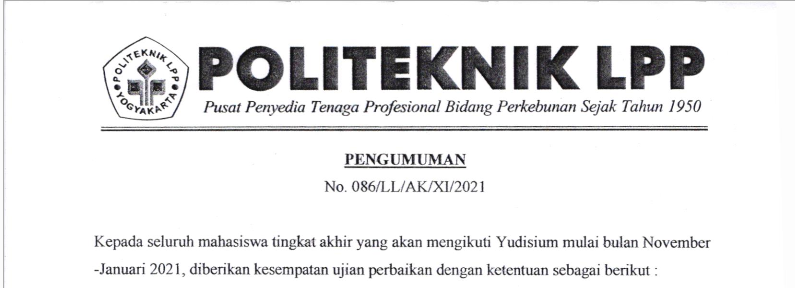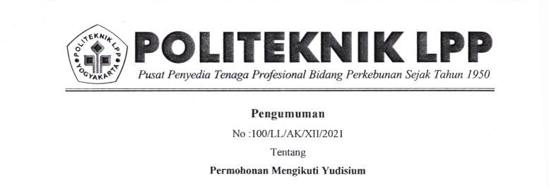 Pengumuman No :100/LL/AK/XII/2021 Tentang Permohonan Mengikuti Yudisium Kepada seluruh mahasiswa Politeknik LPP yang akan mengikuti yudisium wajib melengkapi persyaratan seperti berikut : Mengajukan surat permohonan ke masing-masing pro..
