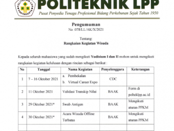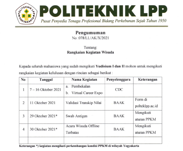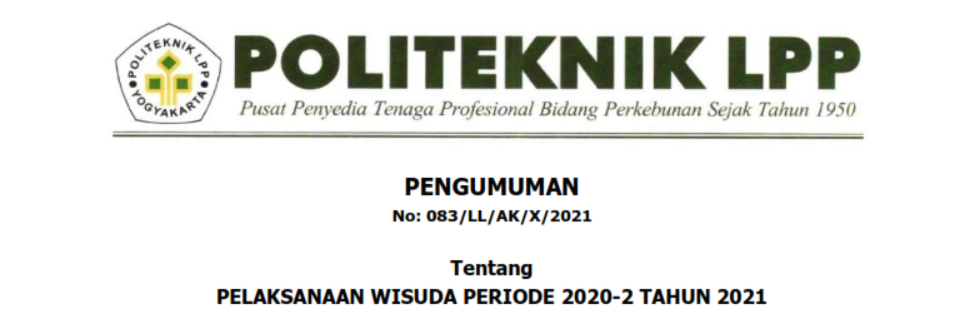PENGUMUMAN No: 083/LL/AK/X/2021 Tentang PELAKSANAAN WISUDA PERIODE 2020-2 TAHUN 2021 Dengan mempertimbangkan kondisi mutakhir pandemi Covid-19, maka Politeknik LPP Yogyakarta memutuskan untuk melaksanakan Wisuda Periode 2020-2 Tahu..