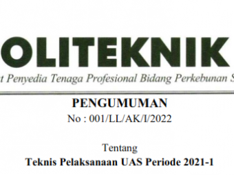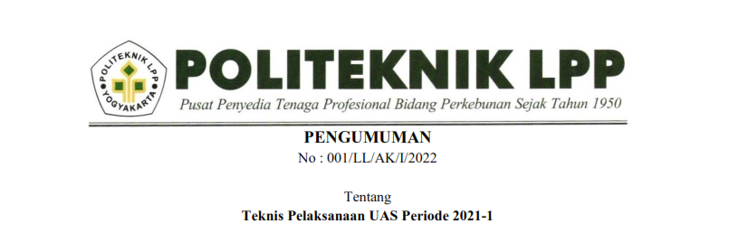 PENGUMUMAN No : 001/LL/AK/I/2022 Tentang Teknis Pelaksanaan UAS Periode 2021-1 Kepada seluruh mahasiswa aktif Politeknik LPP diberitahukan bahwa Ujian Akhir Semester Ganjil TA 2021/2022 akan dilaksanakan dengan metode CBT dan dilakukan ..
