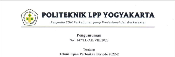 Pengumuman No : 147/LL/AK/VIII/2023 Tentang Teknis Ujian Perbaikan Periode 2022-2 Ujian Perbaikan akan dilaksanakan di Politeknik LPP mulai tanggal 28 Agustus 2023. Mahasiswa hanya diperbolehkan melakukan ujian perbaikan sesuai semeste..