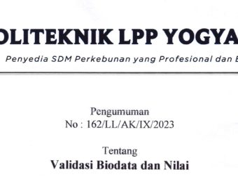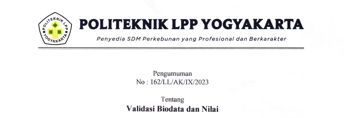PENGUMUMAN No : 162/LL/AK/IX/2023 Tentang Validasi Biodata dan Nilai Bagi Mahasiswa tingkat akhir menyerahkan ke Loket BAA atau mengirimkan via email (yudisium@polteklpp.ac.id) surat pernyataan pra yudisium (bisa didownload di website p..